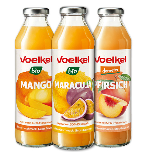 Süßer Nektar mit Direktsaft. Ideal für erfrischende Schorlen oder zum Mixen von Cocktails und Drinks. Fruchtgehalt: mindestens 30 %. 3 Sorten. (Mehrweg-Glasflasche)